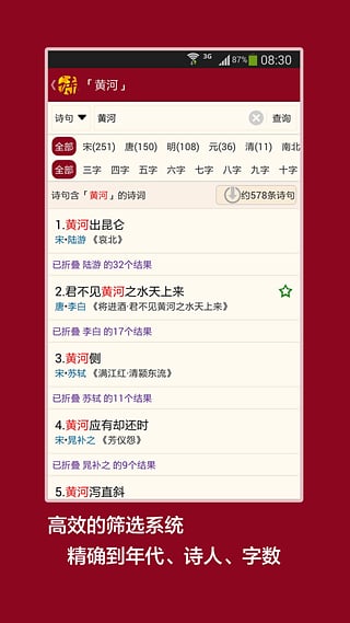 8、强大的查询功能,支持按作者、标题、诗句、句首、句尾进行查询。
