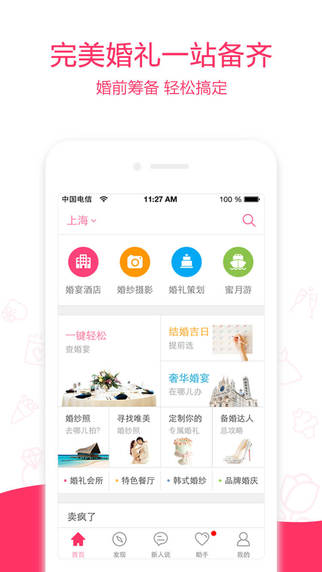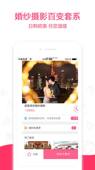 ·婚宴酒店:每周推出精选婚宴酒店,婚纱摄影预订大团购,订婚宴立即返现高达20000元,另有万元礼包返利拿,优惠乐享不停!·婚纱摄影:大牌云集,底价出击!一对一私人定制,罗马风情、塞班热恋、巴厘岛浪漫、韩式Style,总有一款你最爱,时尚由你说了算。