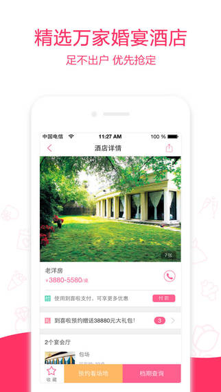 【低价保障】酒店商户独家优惠,享全网最低价,更可免费领取价值万元的结婚大礼包,比实体店便宜,比婚博会便宜!
