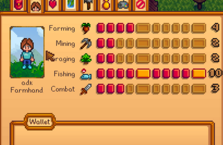 6、新档21天,鱼王和装备截图,斧头在升级铁斧头目前钓鱼10级,农业5级。目标是夏季农业自动化