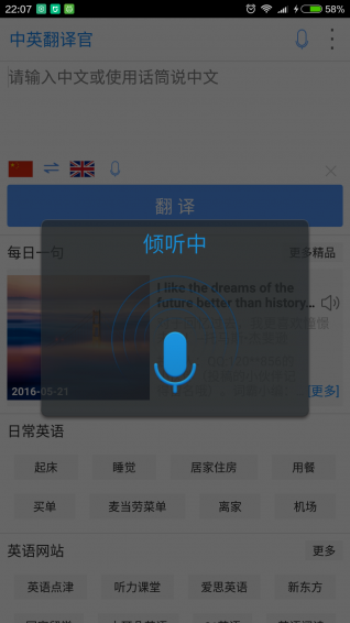 1,简洁的翻译界面,提供舒心的翻译功能。2,提供智能的语音识别翻译功能,同时可以查看翻译历史,收集实用的翻译句子。