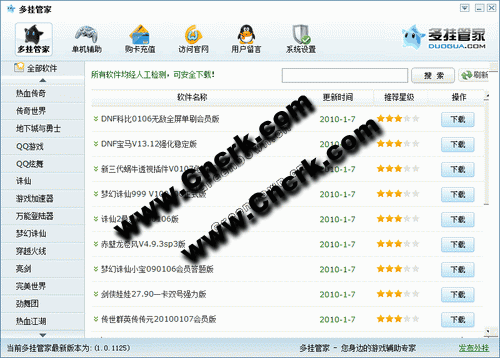多挂管家(工具下载辅助软件)是互联网上最好用、最安全、最绿色的新一代辅助软件,拥有与网站同步数据库更新功能,包括单机工具频道、购卡充值频道、用户留言及系统设置功能,并且在线下载速度超越网站下载速度,软件大小竟不到1MB特别适合网吧和家庭电脑使用。 六大性能: 1.万款辅助工具闪电下载采用全新数据库互联技术,实现软件与网站同步更新,在线下载速度超越网站下载速度。 2.独立单机辅助工具频道单机CS及各类辅助工具独立分类,寻找更方便用户体验永远放在第一位。 3.上帝式在线买卡特轻松去掉一系列繁琐充值步骤,打开软件就能直充帐号,更方便、更快捷、更安全。 4.强大在线工具搜索功能动态识别数据,达到零秒搜索结果。任意输入一关键字单词,轻松展示搜索结果。 5.用户留言VIP快速解决如发现软件及下载工具有任何疑问,用户可在线提交问题,享受VIP待遇级快速解决。 6.软件小巧适合家庭网吧下载工具任选路径保存,开机可选随机启动,软件小巧特别适合网吧及家庭用户使用。