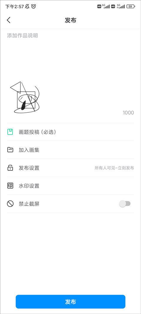 3、点击打开,便能进入发布界面。在此界面,你不仅要添加作品说明,还可对画题投稿说明、发布设置、水印设置等功能进行设置。