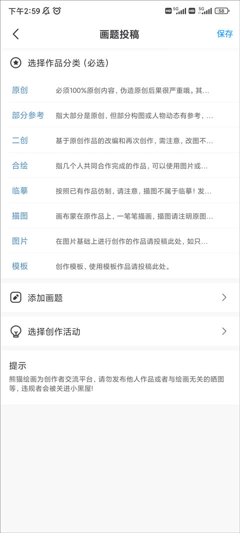 4、点击“画题投稿”,在此处你能够选择作品分类、添加画题、挑选创作活动等,完成操作后点击保存即可。