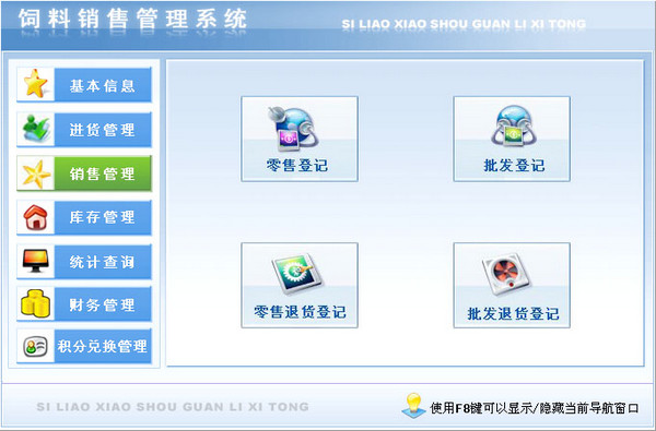 1、基本信息:商品信息、客户信息、供货商信息、员工信息、单位设置;2、进货管理:进货登记、退货登记;