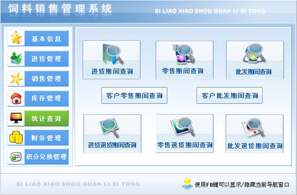 5、统计查询:进货期间查询、进货退货期间查询、零售期间查询、批发期间查询、客户零售期间查询、客户批发期间查询、零售退货期间查询、批发退货期间查询;