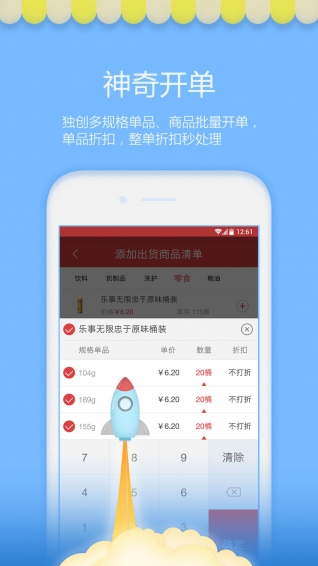 针对开单重点设计,对折扣、数量、金额都针对性的优化,可以单个商品折扣符合大家的使用习惯,新增支持多单品批量操作功能,左右滑屏幕切换分类更方便,新的键盘更清晰,新的购物车更直观,总之是强大无比;