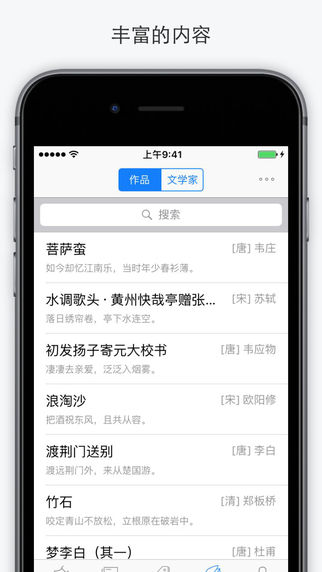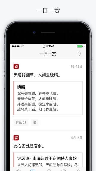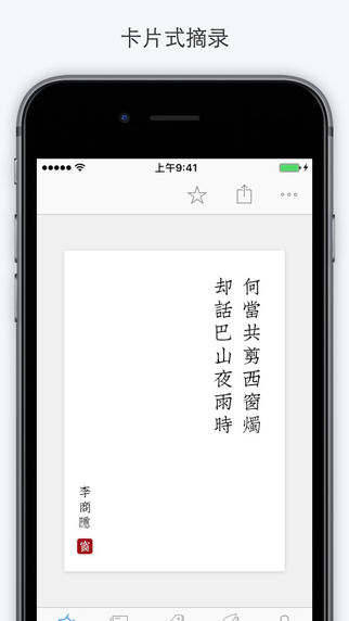 *卡片式摘录:精选1581条诗词名句,卡片式切换*一日一赏:每天推荐一首文学作品,一起来欣赏吧!