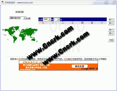 万年历宝贝 V1.0 简体中文绿色免费版 万年历宝贝V1.0只有一个文件,无需安装,直接运行即可使用,是一款简单实用的绿色日历软件。可最前显示、嵌入桌面,也可透明显示,包括至少800年(1600~2400年)的日历,主要有公历、农历、星期、星座、干支、属相、节日、节气、九伏梅等信息。