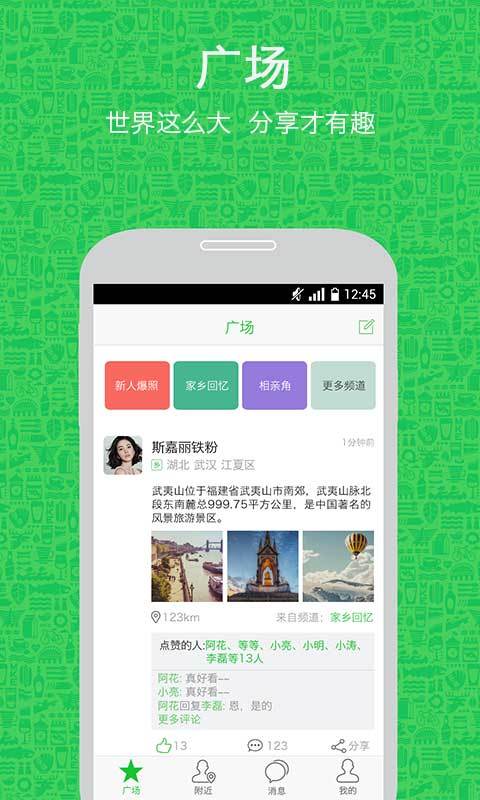 【广场】广场可以发文字、发图片,展现自己的每一分美好,在这里可以发现你的“同类”,互相点个赞,打个招呼,分享你的生活惊喜。