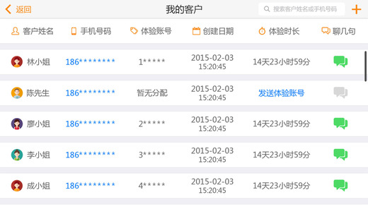 4、商家用户可记录顾客信息并向顾客发送体验账号。