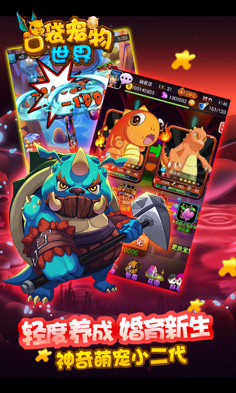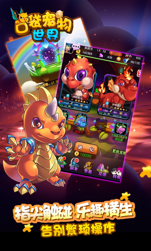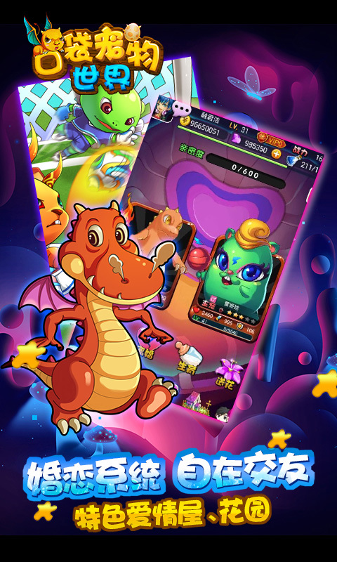 《口袋宠物世界》是一款以社交、养宠、婚育为核心的宠物婚恋类SNS卡牌手游,游戏在传统卡牌闯关玩法的基础上,创新加入了主角天赋与宠物装备系统,搭配多种阵型让战斗场面更精彩。此外,强大的社交系统让你随时搜寻身边的萌宠小伙伴,打造超萌朋友圈。大量熟知的动漫元素和经典造型,灵活简便的操作和丰富自由的玩法,共同构筑了这款轻松愉悦的社交手游。特有的婚育、奇遇、替补系统让游戏更加充实生动。大魔王破坏了动漫世界,囚禁了皮卡丘、阿拉蕾、哆啦A梦等众多动漫英雄,作为主角的你,赶快踏上拯救他们的奇幻冒险之旅吧!【游戏特色】
