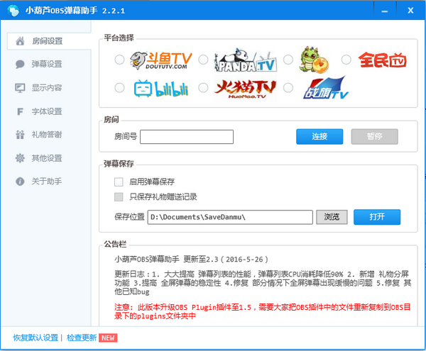 小葫芦BS弹幕助手是由小葫芦工作室推出的一款OBS直播软件弹幕辅助工具。本软件全网第一家支持弹幕显示、全屏弹幕、自动答谢、礼物统计、弹幕保存等强大功能,一键设置轻松搞定。【注意事项】