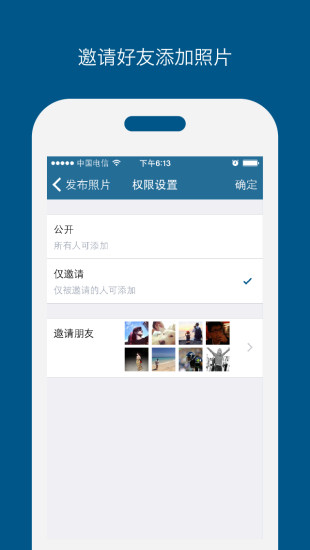 可以邀请软件内或者微信、微博等主流社交软件的朋友添加照片。