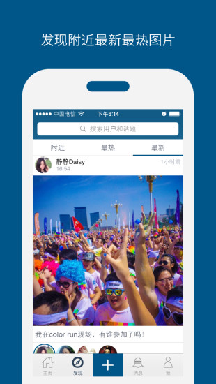 1.发现发现附近最新最热的图片,参与同城最热门话题。