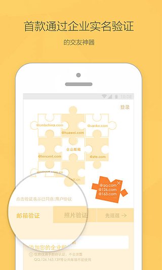 1、首款需要通过企业实名认证的交友神器,高端真实2、1.2万家大型企业的单身员工已经入驻,包括腾讯、阿里巴巴、百度、搜狐、华侨城、华为、中兴、万科、花样年、平安集团、招商集团、深圳航空、华润、展动力等