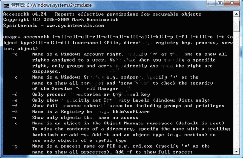 AccessChk用法:accesschk [-s][-e][-r][-w][-n][-v][[-k][-p][-c]|[-d]] [用户名] <用户名> <文件、目录、注册表项、服务>
