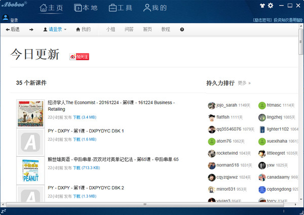 1.精美课件赏心悦目:Aboboo!课件格式极为丰富和自由,学习《新概念》,基本可以合上书本了。2.内置字典丰富实用:听音查字(16万)、英英(5万)、汉英(7万)、英汉 (26万)、图片(5千)、例句(15万)、搭配(2万)等。