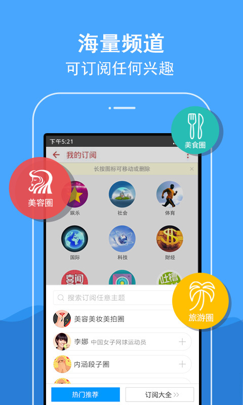 3. 基于大数据进行个性化新闻推荐,以顶尖算法聚合各大门户及微信的全平台新闻资讯,涵盖热点新闻、科技、国际、财经、社会、军事、汽车、娱乐、段子、图片、体育…