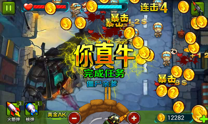 十大战役场景,上百张战斗地图,还有超紧张刺激的boss模式;十几种不同武器供你选择,黄金AK给你带来超舒爽的战斗刺激感,还有超级炸弹辅助你保卫世界,给你带来不同的战斗体验,肯定让你战斗到high起来