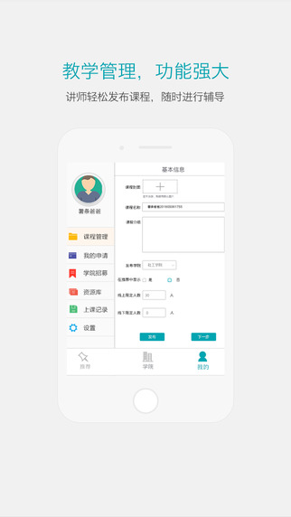 【互动云课堂】 主要有视频语音互动、双向板书互动、课件分享、通过举手、插话、换页、授权等互动功能实现线下课堂教学场景。【学院管理】 可以发布学院公告信息、讲师招聘信息与管理, 发布、审核、编辑课程的信息,课时统计。