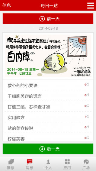 1.可以新增家庭成员,并按成员筛选资讯。如主妇关系美容、妇科,儿子关注成长,丈夫关心职业病等。2.多数适合老年人阅读的文章,都配有有声朗读功能。