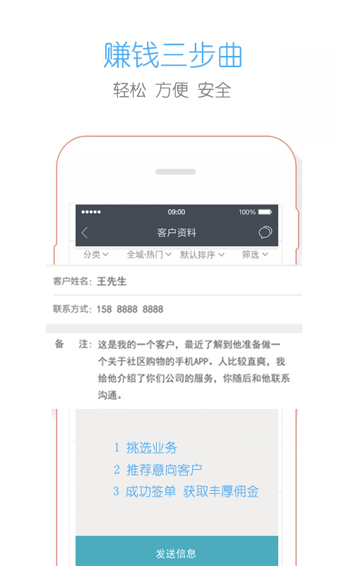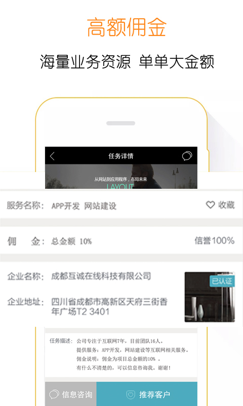 下载注册,实名认证后,就可以发布自己的业务信息,同时不要忘记标注合适佣金。然后就可以坐等其它用户将意向客户“送上门来”。和客户洽谈合作成功后支付用户佣金。借助产品,更加有效的宣传推广自己的产品或服务,轻松高效提升自己的销售业绩,间接获取高工资。