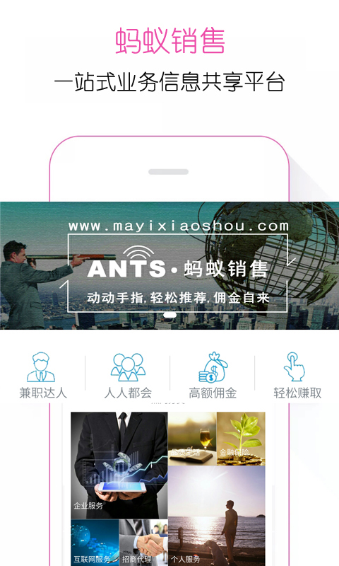 蚂蚁销售是指人人参与销、售的意思,即把公司的服务内容发布于APP上,同时将可观的佣金也一并列出,通过利益驱动全民推广销售,解决传统销售方式存在的一系列问题,有效提升个人销售业绩和公司收益,同时为社会提供更多工作机会。