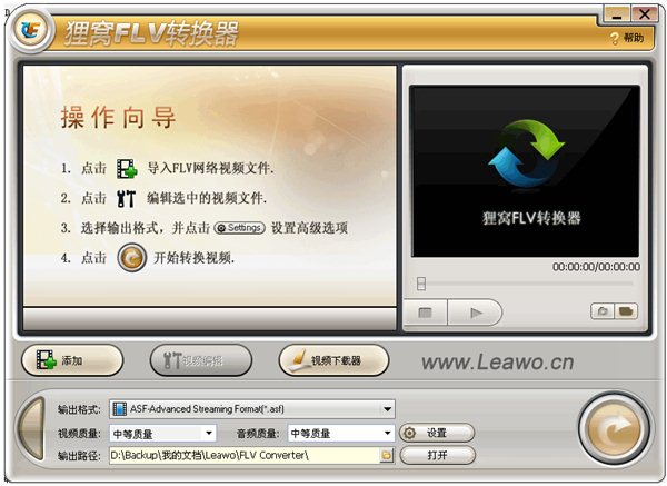 狸窝flv视频转换器是一款功能强大、界面友好的FLV音视频转换及编辑工具。集成视频裁剪、拆分、合并及加水印功能,支持将FLV格式网络视频转换为其他视频格式。如转换成:RM、RMVB、VOB、DAT、VCD、 DVD、SVCD、ASF、MOV、QT、MPEG、WMV、 MP4、3GP、DivX、XviD、AVI、等视频文件,编辑转换为手机、MP4机等移动设备支持的音视频格式。有了狸窝flv转换器,您可以把FLV格式的视频转换成所有的流行音视频格式。
