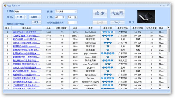 淘宝易搜是淘宝购物的辅助工具,搜索用户感兴趣的商品,可直接看到相关商品的价格、卖家、卖家信用、所在地、好评、及累计成交量等,并可通过软件直接进入淘宝网站相应商品页面进行购买。软件使用比较简单,也便于用户找到自己感兴趣的且便宜又放心商品。解压后即可使用,无需安装。