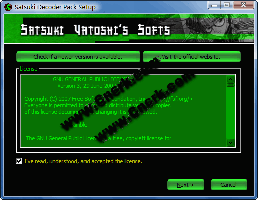 Satsuki Decoder Pack V5.1.0.0 安装版 Satsuki Decoder Pack 是一个音频和视频的滤镜/解码包的合集。用于播放一些特殊格式的文件。Satsuki Decoder Pack包括视频和音频解码器,由三部分组成:主体模块、WM模块和quicktime模块。如果你没有wmp9或以上版本,你需要安装WM模块;如果没 有安装quicktime或者ithune,则需要安装 quicktime模块。它的特点是只解码而不添加解码器,这样既节省了磁盘空间又减少了代码冲突的可能。