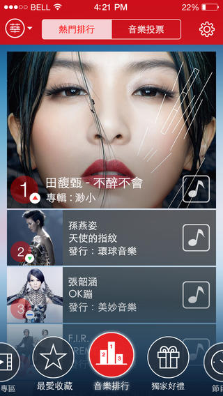 华语、西洋、日亚、金全球金榜四大排行让你掌握流行动向,抢先试听新歌。