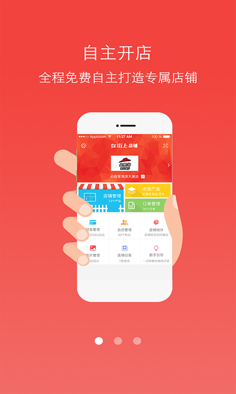 在街上手机店铺是点石科技开发的实体店铺应用类工具。主要为解决线下商家如何在线上推广营销问题。在街上店铺帮助实体店铺从线下创建到线上手机H5店铺快速生成。实体店铺可应用在街上店铺所提供的工具。进行店铺优惠资讯的发布,通过二维码、微信朋友圈等各种渠道,分享给消费用户。通过用户会员管理,财务管理、数据分析等模块追踪用户行为,了解消费者消费习惯。从而找到自己的店铺的真正的用户,完成用户积累。实现实体店铺在线上自主营销。在街上店铺,超多实体商家选择的线上开店店铺营销专家!0门槛,低成本,支持Android和IOS手机以及web端!让你随时随地做生意,担保交易保证安全,立即下载软件,3分钟即可体验线上开店的快乐!一键分享吸引顾客,随时随地,发布你的商品,优惠券,活动,管理订单。丰富有趣的营销应用,精准的数据分析等!更有店铺专属的手机H5店铺,让您的用户无需下载任何app,轻松扫描打开网页,即可畅享购物乐趣!