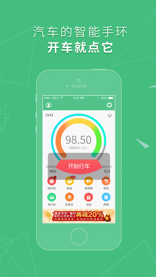 1.APP用户只需在行程开始前点击“开始行车”,后台会自动进行驾驶评分,每天开车赚钱轻轻松松!