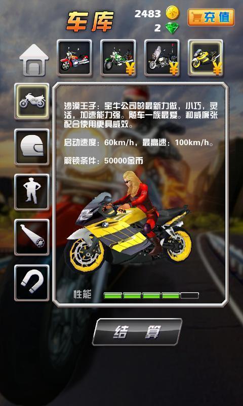 在您获得金币之后,可以进入车库购买道具和配件,除了让你的车更加华丽养眼外,还有更多加速、增加生命等神秘道具等您探索,让你的极速之旅倍添乐趣。