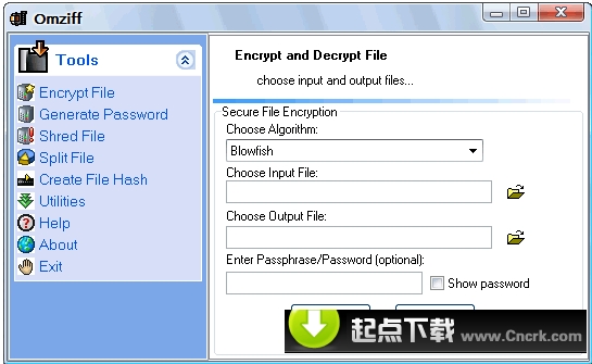 Omziff 是一款简单的加密软件,它能使用各种不同的加密算法来加密或者解密文件。包括: Blowfish, Cast128, Gost, IDEA, Misty1, AES/Rijndael, Twofish.等七种算法此外还有多种功能,如:随机密码生成器,文件粉碎机,文件切割机,哈希值计算器。