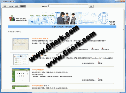资源搜索工具 V1.0 简体中文绿色免费版 只需要输入搜索内容,工具自动把全世界最常用的搜索网站找到的Word、Excel、Pdf、Ppt,Chm类型的文件列出来,其中返回的搜索网站包括:百度、谷歌和搜狗。它能集中的为各位网友搜索有用的资料,同时不需要切换IE在各个搜索网站重复输入搜索内容,使用起来方便、快捷、实用。