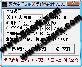 功能介绍:1.倒计时关闭系统.2.定时关闭系统.3.多方式选择关闭方式.用于人离开电脑后,设定定时,以便节省不必要的耗电,本软件可以选择关闭方式,关机/重启/注销/休眠/冬眠/都可以强制执行!