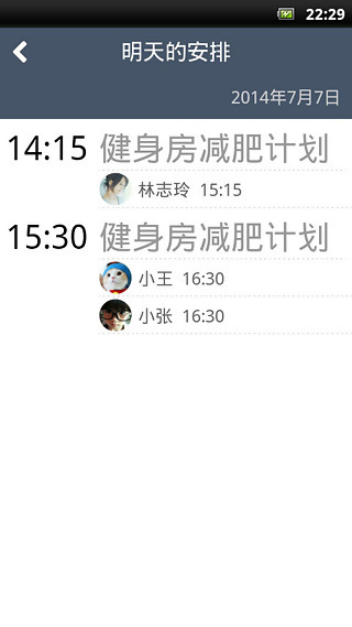 5.动态:仅显示今天一天的详细日常安排,今天的健身计划各是几点到几点,有哪些学员参加,一目了然;