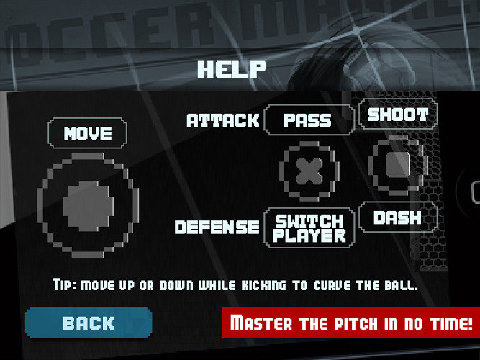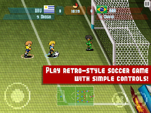 就如同游戏中的名字一样,游戏采用了复古的像素风格的画面设计,而且背景音乐也用的是电子乐风格。游戏乍看上去和小时候看经典足球动漫《足球小将》有那么一点类似,在游戏中玩家可以选择国家队征战绿茵场,通过一场又一场的胜利最终站在世界之巅。游戏的操作方式非常简单,只通过两个按钮可以完成游戏中的所有操作。