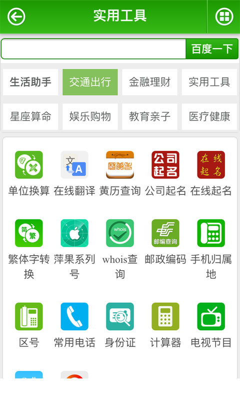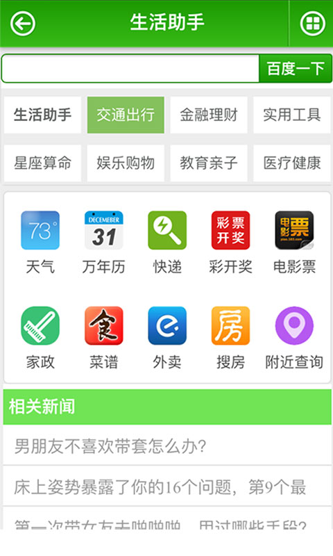 支持常用查询:天气、万年历、快递、附近银行、附近超市、附近医院、附近KTV、附近按摩、附近洗浴、交通出行、火车票/飞机票/汽车票定购查询、违章查询、景点门票、度假旅游、路况查询、附近酒店宾馆查询、个人房贷、商业房贷、公积金贷款、车贷计算等。