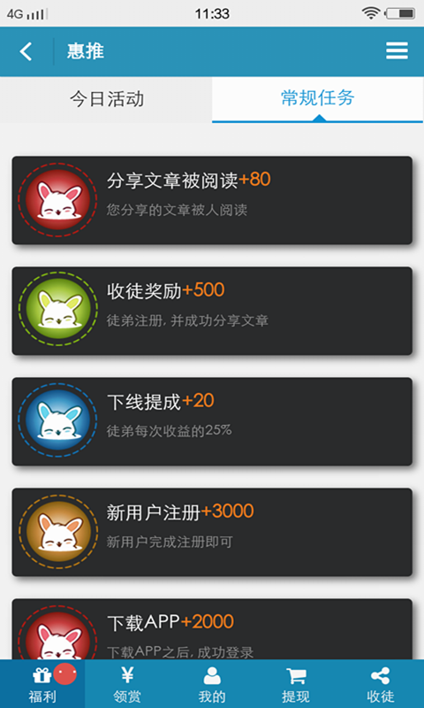 惠推阅读app是专为分享优质文章赚钱打造的应用,能随时选择自己喜爱的文章分享到社交平台赚取佣金,支持点击分成服务,是您分享文章赚钱的好帮手。【软件特点】
