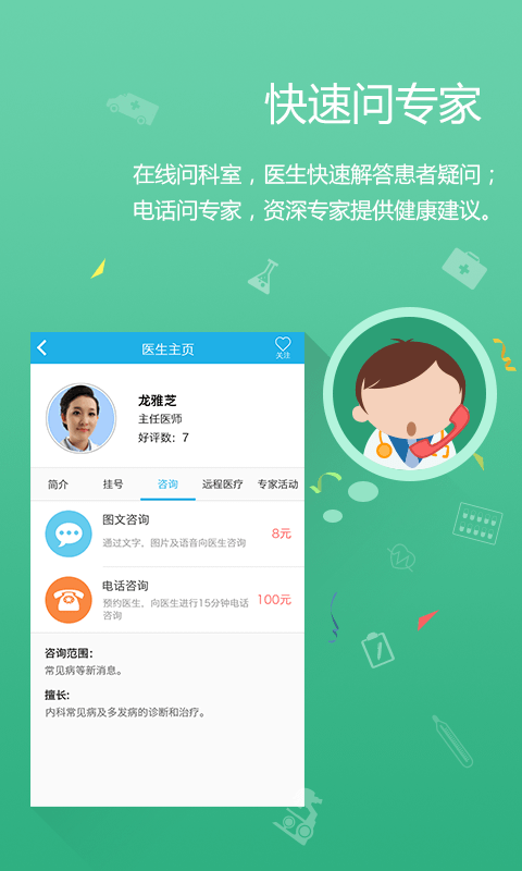 1.在线问诊:在线咨询导诊台和科室医生;2.专家诊室:享受多种形式的专业医疗咨询服务,让您与专家沟通无障碍;