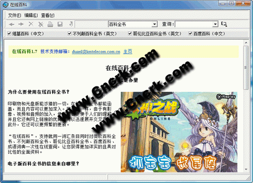 知识就是力量,“在线百科”,一个让您免费拥有包知“大不列颠百科全书”、“哥伦比亚百科全书”等四套百科全书、英汉、汉英字典、成语词典的软件。