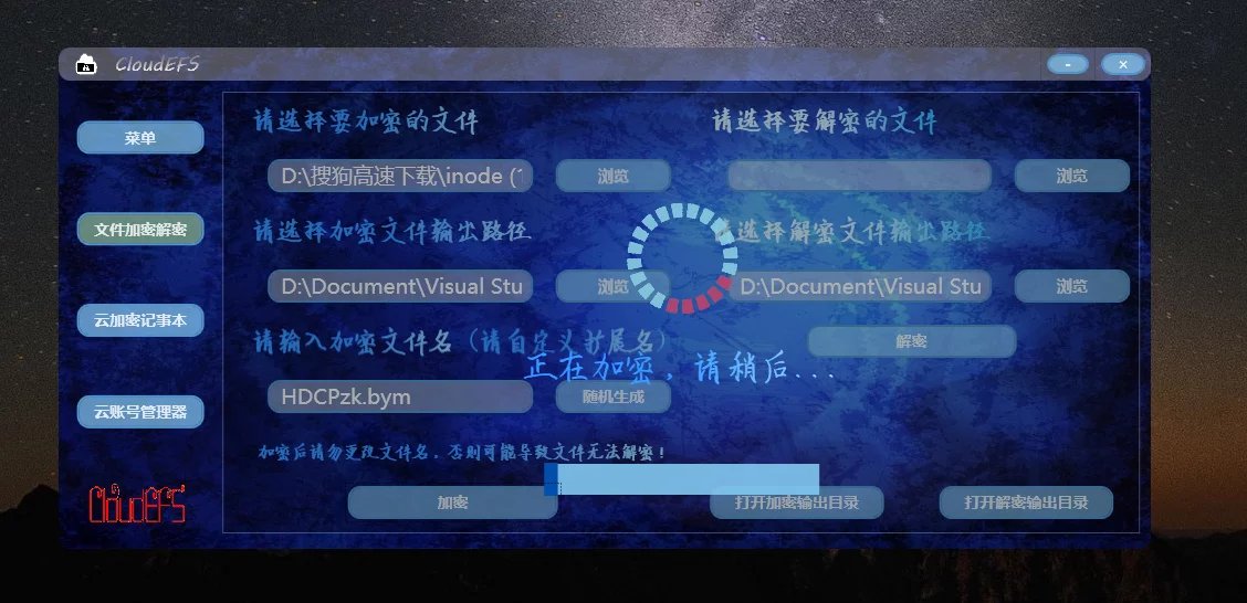 CloudEFS文件加密是一款绿色安全的文件加密软件。该软件加密解密的速度非常快,只需5秒即可轻松加密解密,并且可支持跨平台使用,有需要的朋友赶快拿下。