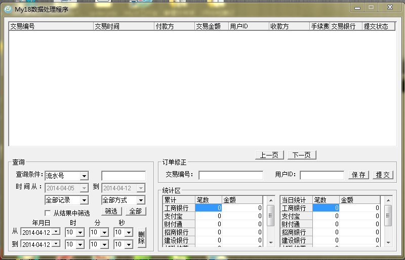 14.排序功能,数据管理程序中可按交易编号、交易时间、交易金额、附言内容、手续费、提交状态进行正倒序排列,还可调整每列的宽度以方便查询具体信息。