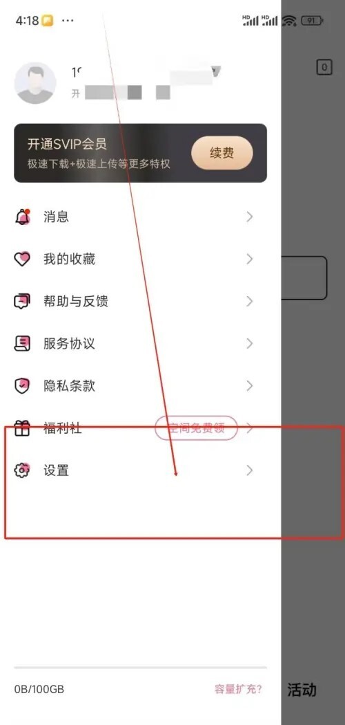 2. 在左侧弹出的个人界面里,点击设置选项。
