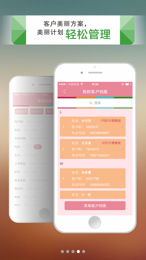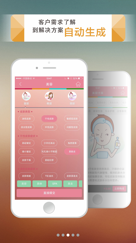 美丽需求:为用户诊断,推荐需要的项目!美丽档案:管理用户,更好的为用户提供服务!