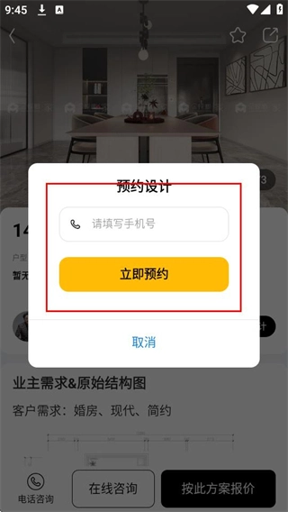 4、于预约设计页面,填入手机号,随后点击“立即预约”,即可完成设计预约。