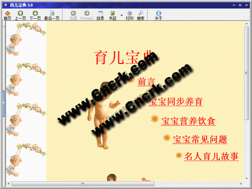 育儿宝典 V3.0 简体中文绿色免费版 本程序是一套实用易查、权威科学、培育优质健康宝宝的经典电子书,目的是向为人父母者介绍有关育儿方面权威的、最新的、最实用的常识。内容包括宝宝365天的同步养育;宝宝营养饮食;宝宝常见问题及对策;名人育儿故事。其中365天的同步养育包括宝宝发育、营养、饮食、养育、疾病防治、科学教养的方方面面;宝宝营养饮食大全详细介绍了上百种适合宝宝养育的菜单和饮食原则...